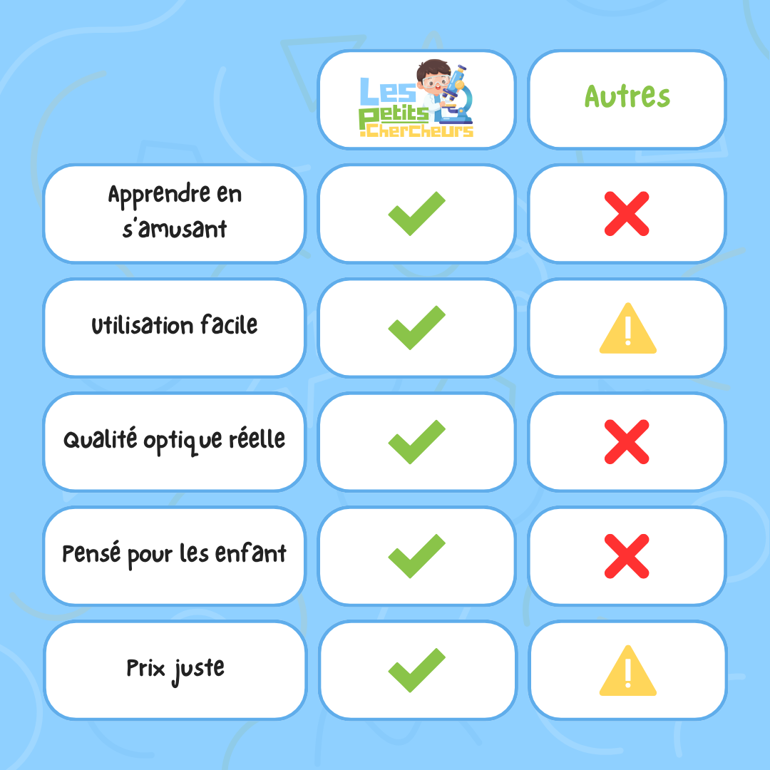 💧 Non, car chaque exploration révèle quelque chose de nouveau. Observer une feuille, un insecte ou des cristaux crée toujours de nouvelles découvertes. Le kit grandit avec la curiosité de votre enfant.